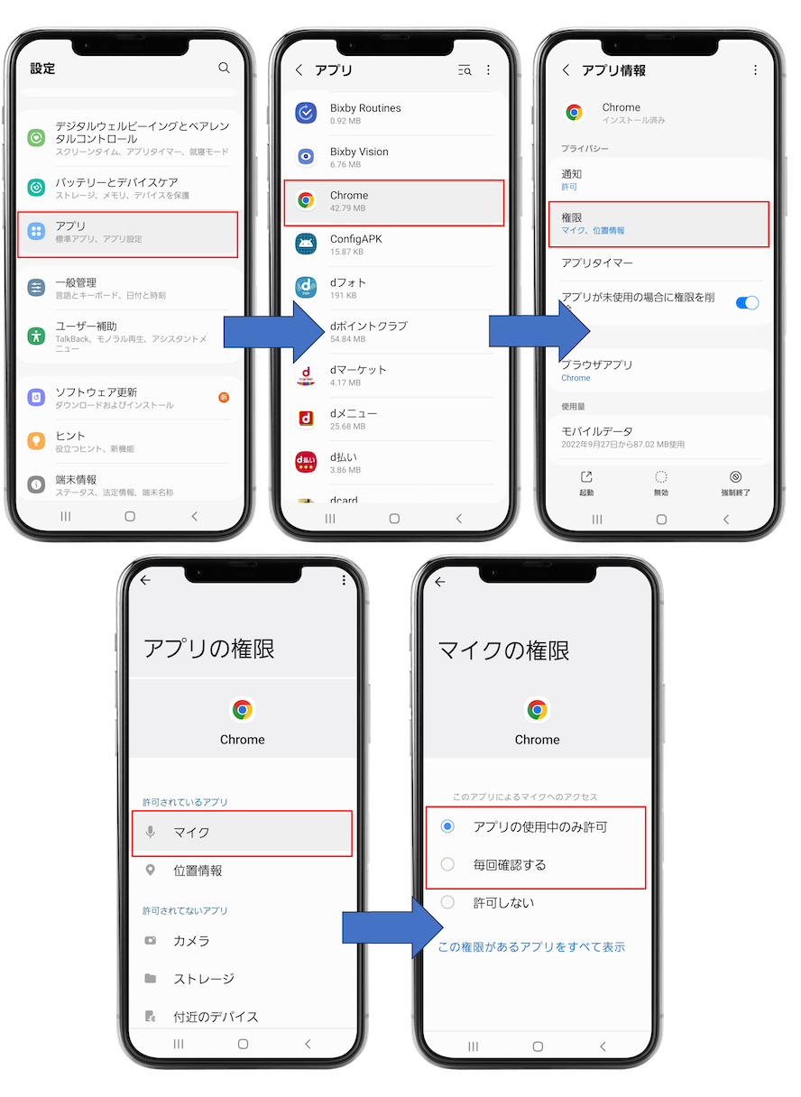 「設定 > アプリ > Chrome(またはSafari) > 権限」から、「マイク」を選択、次に表示された画面でマイクの設定が「許可しない」になっていた場合は「アプリの使用中のみ許可」または「毎回確認する」を選択してください。