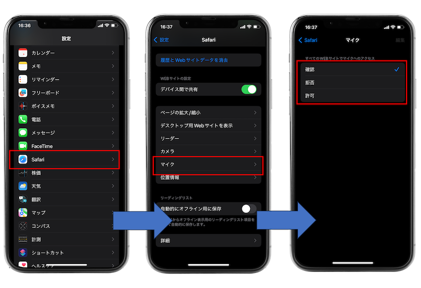 「設定 > 一般 > Safari(またはChrome)」から、「マイク」を選択、次に表示された画面でマイクの設定が「拒否」になっていた場合は「確認」または「許可」を選択してください。