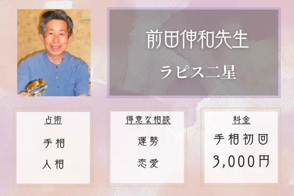 前田伸和先生は、手相で持って生まれた運勢や未来の運勢について両手の細かい線まで見ながら鑑定したり、人相で金運や出世運、晩年運など生涯の運勢を占うのが特徴です。