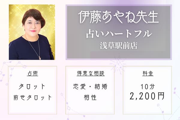 | 占いハートフル | 30分 3,300円〜 | 恋愛、結婚、相性など | タロットなど | 浅草駅から徒歩8分 |