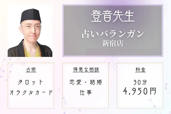 | 新宿占い館バランガン | 30分 4,950円 | 恋愛、結婚、仕事など | タロット、オラクルカードなど | 新宿駅から徒歩3分 |