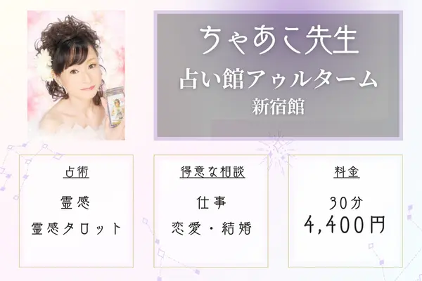 | 占い館 アゥルターム 新宿館 | 30分 4,400円 | 仕事、恋愛、結婚など | 霊感・霊感タロットなど | 新宿駅から徒歩1分 |
