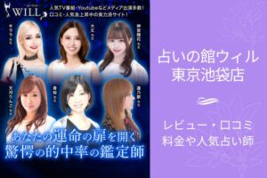 | 占いの館ウィル 池袋店 | 30分 4,980円(初回のみ) | 恋愛、人間関係など | 写真鑑定、霊感・霊視など | 池袋駅から徒歩3分 |