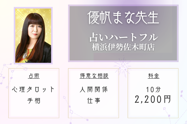 | 占いハートフル横浜伊勢佐木町店 | 10分2,200円 | 人間関係、仕事、転職など | 心理タロット、手相など | 関内駅北口から徒歩10分 |
