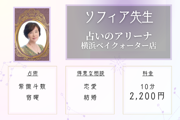 | 占いのアリーナ 横浜ベイクォーター店 | 10分2,200円 | 恋愛、結婚、人生相談など | 紫微斗数、宿曜など | 横浜駅きた東口Aから徒歩3分 |