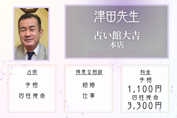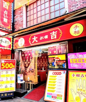 | 占い館大吉本店 | 手相鑑定1,100円 | 恋愛、結婚、仕事など | 手相、四柱推命など | 元町・中華街駅から徒歩3分 |