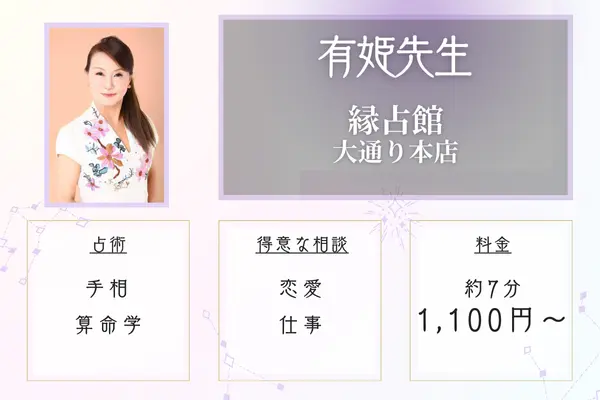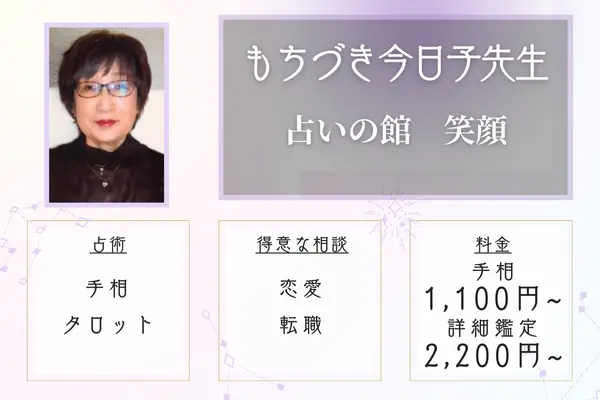 | 得意な相談内容 | 恋愛、結婚、仕事、家族、引っ越しなど |